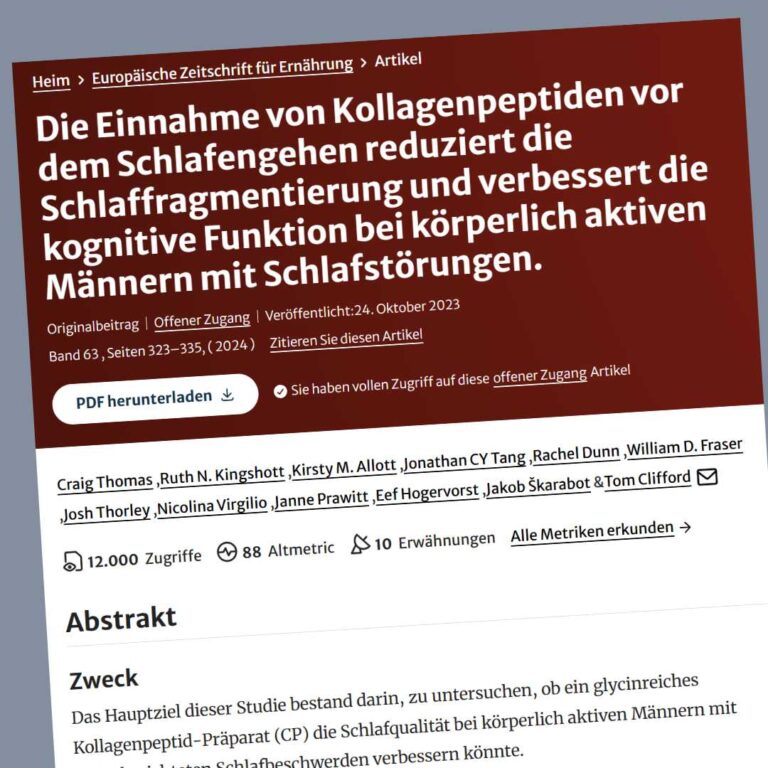 Demnach soll die Kollagen-Einnahme vor dem Schlafengehen nicht nur die nächtliche Hautregeneration unterstützen, die ohnehin dann auf Hochtouren läuft, sondern nachweislich auch die Schlafqualität verbessern.